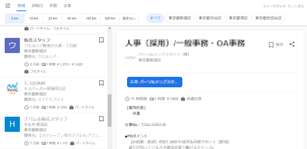 Googleで求人情報を検索する場合、例えば「新宿 求人」というキーワードを入力します。これにより、Googleの求人検索機能がアクティブになり、対象地域に特化した求人情報が表示されます。